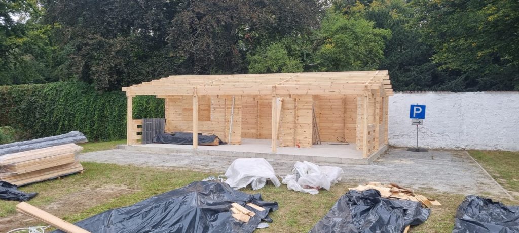 Robert und Karsten haben mit dem Aufbau des Blockbohlenhauses begonnen.