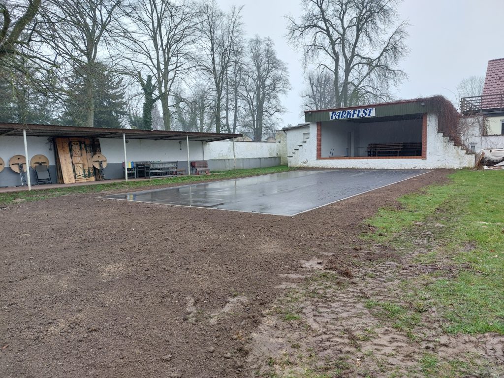 update 21.03.2024: Die Tanzfläche ist fertiggestellt, ebenso die Gründungsplatte für das Blockbohlenhaus